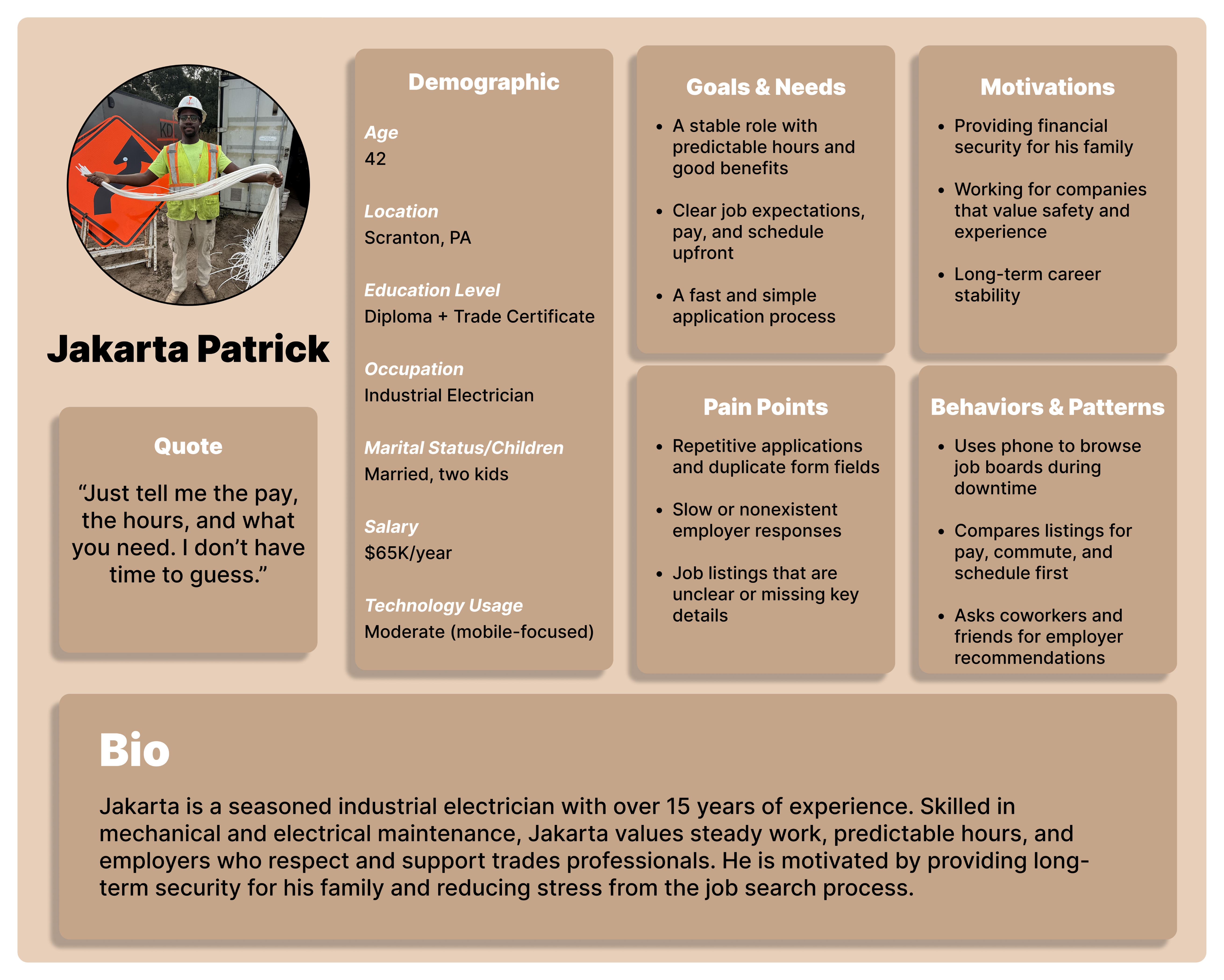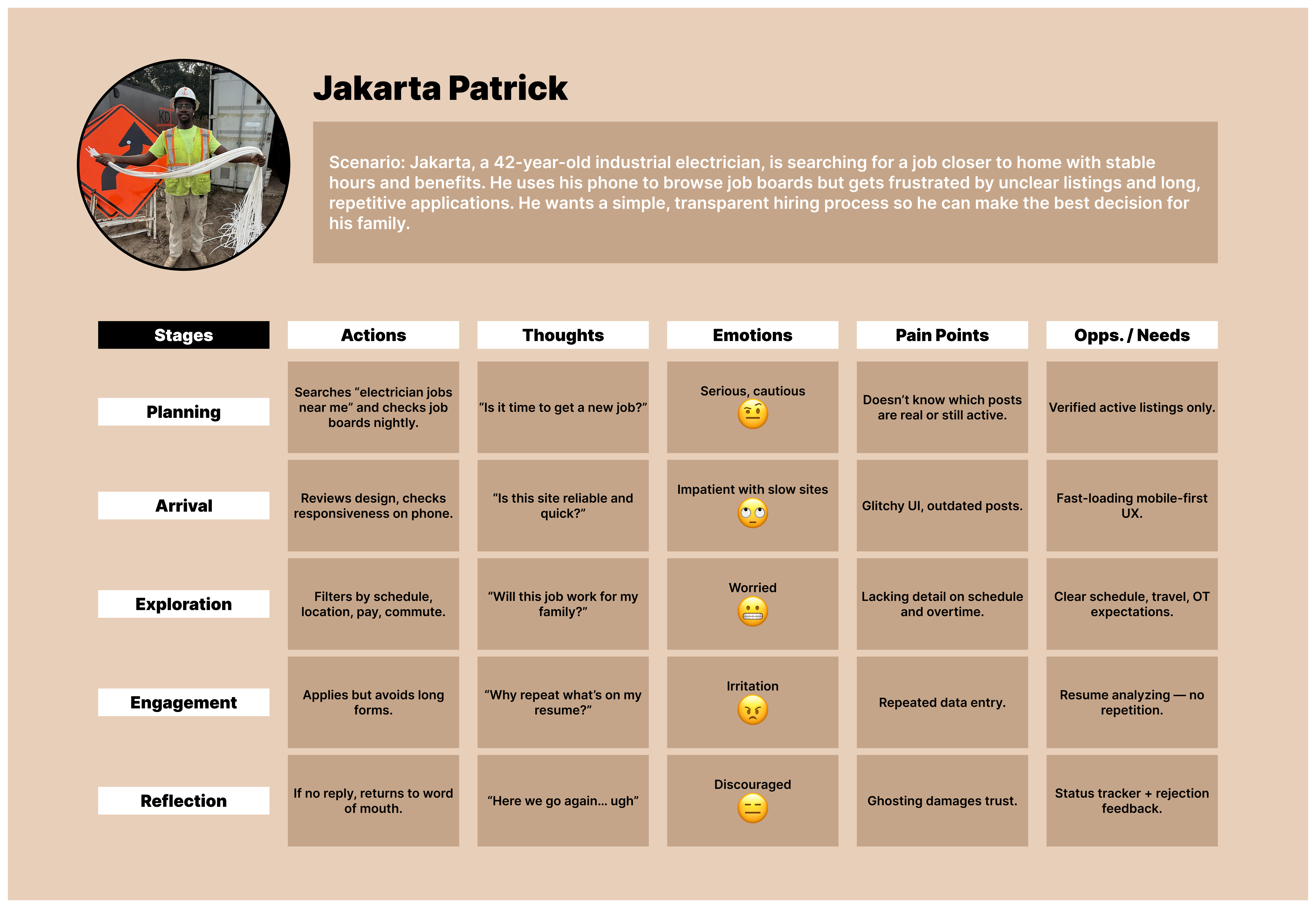 Jakarta Patrick, a 42-year-old industrial electrician, represents stability-focused workers. With a family to support, he prioritizes pay transparency, predictable schedules, and short applications. He’s especially frustrated by outdated listings and companies that never respond.